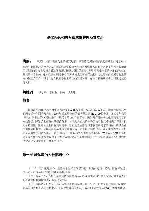浅析沃尔玛物流管理对我国超市的启示目录1、沃尔玛的物流管理现状 (4)2、沃尔玛物流管理的特点 (5)2.1灵活高效的物流配送中心 (5)2.2强大的物流信息技术 (5)3、我国连锁超市物流管理现状 (5)3.1.物流的社会化和专业化程度低 (5)3.2.物流信息技术手段落后 (6)3.3.标准化程度低 (6)3.4.第三方物流发展缓慢 (6)3.5.配送效率低下 (6)4.沃尔玛的物流合理化对我国大型连锁超市物流业的启示 (7)4.1加强基础设施和设备建设 (7)4.2完善信息系统的各项功能 (7)4.3形成共赢零售业价值链的合作机制 (7)4.4要整合物流系统的各个组成部分 (7)4.5联合建立配送中心或者配送中心外包 (7)4.6加强员工的物流知识和业务培训 (8)4.7充分利用物流配送资源增强企业核心竞争力 (8)5.总结 (8)6 参考文献 (8)中文摘要:作为连锁经营的核心技术,物流成为超市经营竞争的焦点。
