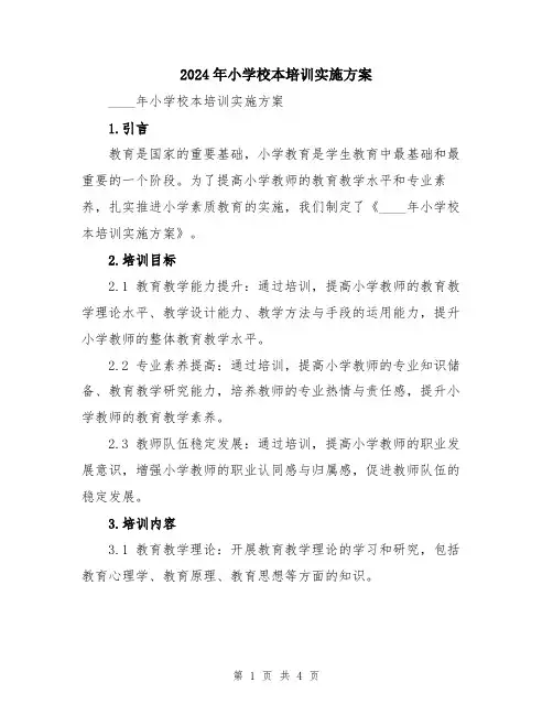 2024年度校本培训实施方案范文____年度校本培训实施方案一、前言校本培训是学校发展的重要组成部分,也是教师专业成长的有效途径。