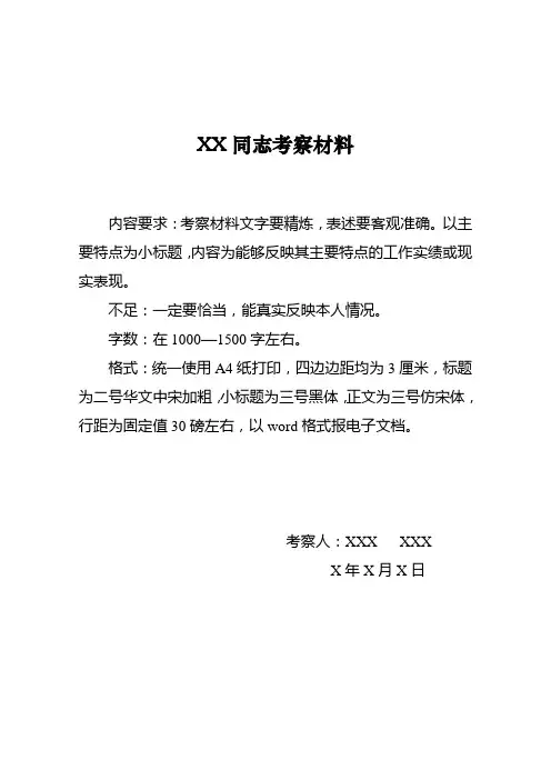 二、格式要求标题为“×××同志考察材料”,字体为“方正小标宋简体(二号)”,正文字体为“仿宋体(三号)”。