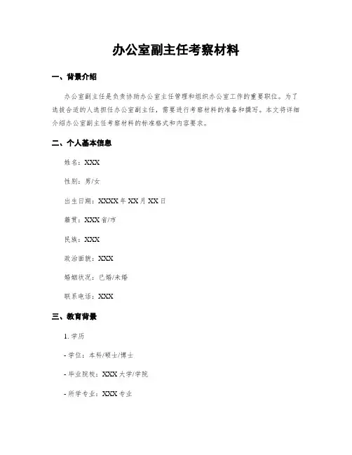 办公室副主任考察材料一、背景介绍办公室副主任是负责协助办公室主任管理和组织办公室工作的重要职位。