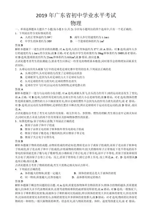 2019年广东省初中学业水平考试物理一、单项选择题本大题共7小题;每小题3分;共21分在每小题列出的四个选项中;只有一个是正确的.. 1.下列说法符合实际情况的是A.人的正常体温约为39℃B.成年人步行的速度约为1.1m/sC.中学生的体重约为50N D.一个篮球的体积约为1m3答案B解析本题属于一道生活常识的估测题..对A选项;人的正常体温约为37℃;故A错误;对B选项;成年人步行的速度约为1.1m/s;符合实际;故B正确;对C选项;中学生的质量约为50kg;即体重约为500N;故C错误;对D选项;篮球的直径约为25cm;即体积约为0.01m3;故D错误..故应选B..点评此题考查考生的估测能力;要求考生应熟记一些常见的物理基本数值;同时要学会将物理知识联系生活实际..2.头球运动员用头碰撞飞行中的足球是足球比赛中常用的技术;下列说法正确的是A.头球过程中;头对足球的力改变了足球的运动状态B.足球被顶飞;是因为头对足球的力大于足球对头的力C.头对足球的作用力消失时;足球的惯性也消失D.足球在空中飞行时;以运动员为参照物;足球是静止的答案A解析本题属于一道力与运动的小综合题..对A选项;球被头顶飞;在头的力作用下;球的运动状态发生了变化;故A正确;对B选项;力的作用是相互的;且相互作用力的大小总是相等的;故B错误;对C选项;物体的惯性是固有属性;且惯性的大小只跟质量有关;所以足球的惯性不会因为头的作用力消失而消失;故C错误;对D选项;以运动员为参照物时;足球的位置在不断改变;所以足球相对于运动员是运动的;故D错误..故应选A..点评此题综合考查了考生对力的作用效果、相互作用力、参照物、惯性的理解;考生要注意牢记相关知识点;同时应重点弄清力的两个作用效果以及影响物体惯性的因素..3.如图是锂Li原子结构示意图;下列说法正确的是A.锂原子由质子和中子组成B.锂原子由带正电的原子核和核外带负电的电子组成C.锂原子的质子数是电子数的两倍;所以锂原子带正电D.锂原子失去电子后带负电答案B解析本题属于物质的组成题..由物质组成的理论知道;物质是由分子或原子组成的;而原子是由原子核和电子组成的;原子是由质子和中子组成的;在组成物质的微粒中;较大的微粒原子正常情况下是不带电的而不带电的原因就是质子数与电子数相等;较小微粒质子带正电;电子带负电;而中子不带电..若原子因某种原因失去电子;则该原子会带上正电;反之;若原子得到电子;则它会带上负电..综上所述;A、C、D选项错误;B 选项正确;故应选B..点评此题重点考查了物质的组成;考生只需熟记相关知识点即可..4.下列说法正确的是A.体积越大的物体;质量一定越大B.固体的密度总是大于液体的密度C.同一物质;质量越大;比热容越大D.晶体都有固定的熔点答案D解析本题属于概念性问题的综合题..对A选项;质量是指物体所含物质的多少;物体含的物质越多;其质量就越大;但体积大并不代表物质就多;还要考虑物质堆积的疏密情况即密度;故A错误;对B选项;一般情况下;固体分子堆积都比较密集;而液体分子堆积相对比较疏松;所以固体的密度大多比液体的密度大;但也有例外;比如冰的密度比水的密度小;水银的密度比许多固体的密度都大;故B错误;对C选项;物质的比热容是物质的一种特性;一般只跟物质的种类、状态有关;而与物质的质量、体积、温度等因素无关;故C错误;对D选项;晶体与非晶体最大的区别就是晶体有固定熔点而非晶体没有固定熔点;故D正确..故应选D..点评此题考查了一些重要的物理概念;要求考生在学习物理过程务必明白;熟记并理解物理概念是学好物理的重要基础..5.赛龙舟不仅是一项体育娱乐活动;更体现我国悠久历史文化传承..如图所示为某比赛场景;下列说法错误..的是A.选手根据鼓声齐心协力划桨;鼓声是由鼓面振动产生的B.选手听到鼓声大作;震耳欲聋;说明此时鼓声的响度大C.选手能从现场各种声音中听出鼓声;主要是通过鼓声的音色来辨别的D.鼓手敲击鼓面越快;鼓声在空气中传播的速度也越快答案D解析本题属于声现象的综合题..对A选项;声音是由物体振动产生的;所以鼓声是由鼓面振动产生的;故A的说法正确;对B选项;震耳欲聋形容声音非常大;而声音的大小是用响度来表示的;故B的说法正确;对C 选项;在声音的三个特性中;音色是人们辨别不同发声体的主要手段;所以选手能在嘈杂的声音中辨别出鼓声;靠的就是鼓声的音色与其它声音的音色不同从而做到的;故C的说法正确;对D选项;声音的传播速度跟其所处的介质种类及温度有关;而与其它因素无关;鼓手敲击鼓面越快只能使鼓声的音调得以提高;而无法改变鼓声的传播速度;故D的说法错误..故应选D..点评此题重点考查了声的传播速度及其三个特性;要求考生注意理解声的传播速度的影响因素;同时要善于区别声的三个特性及影响三个特性的因素..6.如图所示;灯泡L1、L2的电阻分别为10Ω、20Ω;闭合开关S;通过L1、L2的电流分别为I1、I2;它们两端的电压分别为U1、U2;则A.I1:I2=1:1;U1:U2=2:1 B.I1:I2=1:2;U1:U2=1:1C.I1:I2=1:1;U1:U2=1:2 D.I1:I2=1:2;U1:U2=1:2答案C解析本题属于简单电路题..由图知;L1与L2是串联关系;根据串联电路的电流处处相等的特点;得I1与I2相等;即I1:I2=1:1;故B、D错误;根据串联电路的分压作用;得U1:U2=R1:R2=10Ω:20Ω=1:2;故C正确..故应选C..点评此题重点考查串联电路的电流、电压特点;考生除了要熟记相关知识外;还要懂得把串联电路电流相等
