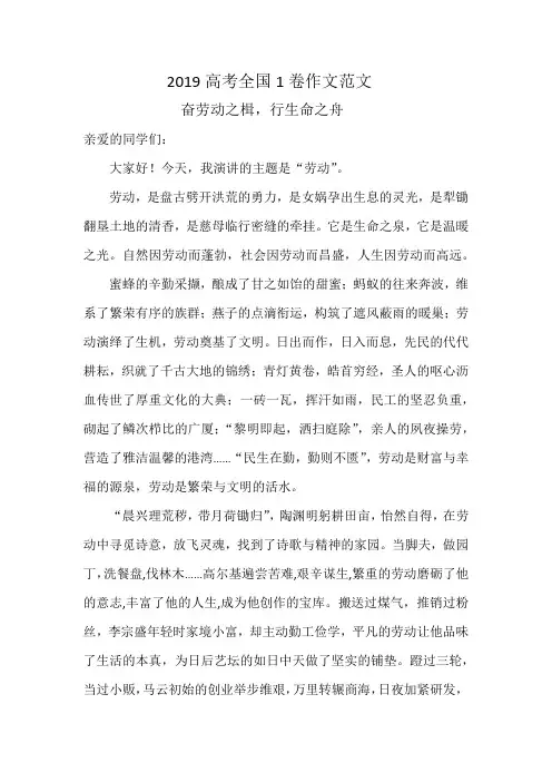 2019高考全国1卷作文范文奋劳动之楫,行生命之舟亲爱的同学们:大家好!今天,我演讲的主题是“劳动”。