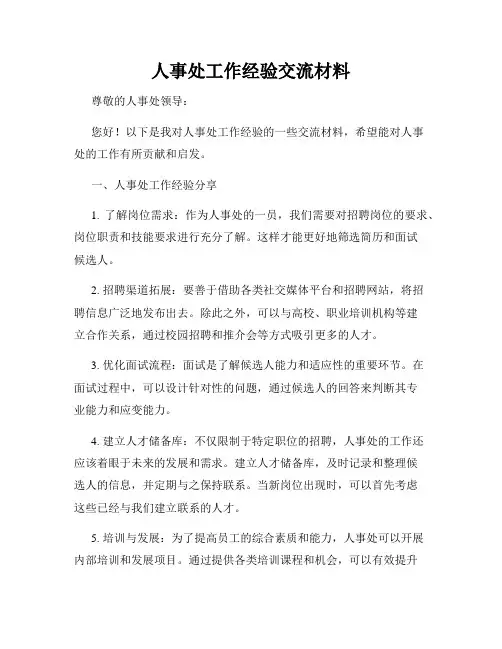 人事股负责人经验交流材料一、人事界经验交流会尊敬的各位领导、各位同事:大家好!我是XX公司人事股负责人,今天非常荣幸能够在这个人事界经验交流会上与大家分享一些我个人的经验和心得。