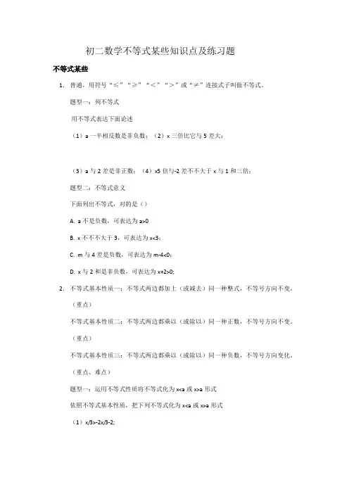 初二数学不等式某些知识点及练习题不等式某些1.普通,用符号“≤”“≥”“<”“>”或“≠”连接式子叫做不等式。