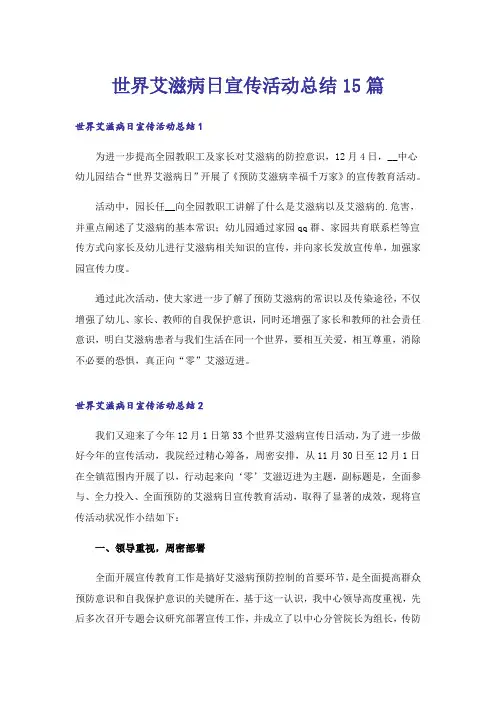 世界艾滋病日宣传活动总结15篇世界艾滋病日宣传活动总结1为进一步提高全园教职工及家长对艾滋病的防控意识,12月4日,__中心幼儿园结合“世界艾滋病日”开展了《预防艾滋病幸福千万家》的宣传教育活动。
