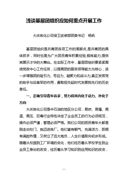 浅谈基层团组织应如何重点开展工作大庆炼化公司保卫武装部团委书记杨帆基层团组织是共青团各项工作的落脚点,是共青团的具体抓手,同时也是为广大团员青年积累经验,锻炼能力,提供其展示才华的大舞台。