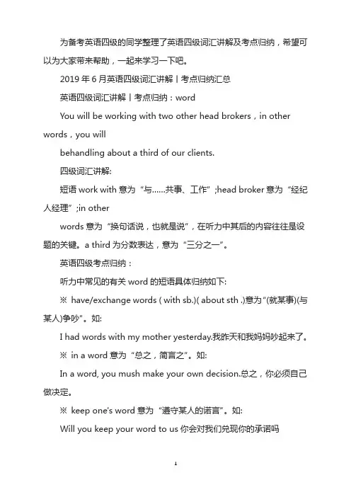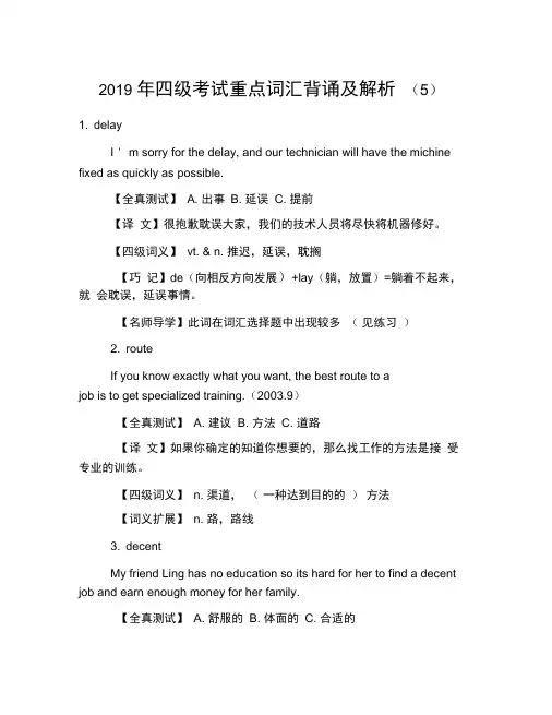 2019 年四级考试重点词汇背诵及解析(5)1. delayI ' m sorry for the delay, and our technician will have the michine fixed as quickly as possible.【全真测试】 A. 出事B. 延误 C. 提前【译文】很抱歉耽误大家,我们的技术人员将尽快将机器修好。
