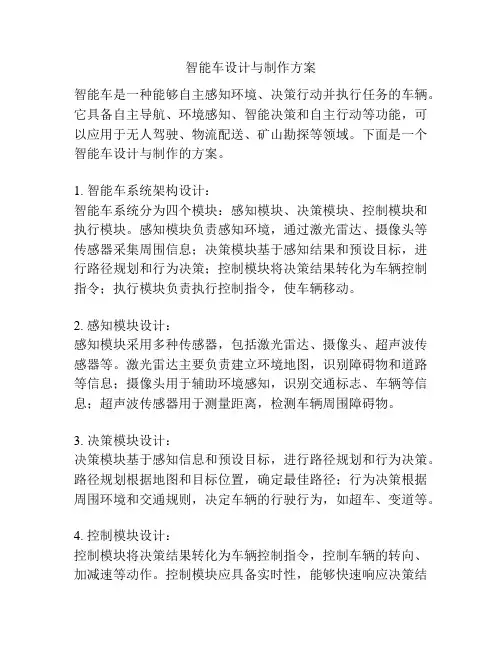 智能车设计与制作方案智能车是一种能够自主感知环境、决策行动并执行任务的车辆。