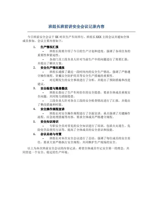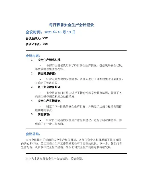 第二篇示例:标头:关于班前安全生产会议记录日期:XXXX年XX月XX日地点:XX厂区XX会议室主持人:XXX记录员:XXX会议内容:1. 主持人开场致辞主持人针对本次会议的重要性和紧迫性进行了开场致辞,强调了安全生产在企业发展中的重要性,并呼吁全体员工要高度重视安全生产工作,确保生产过程中不发生任何事故。