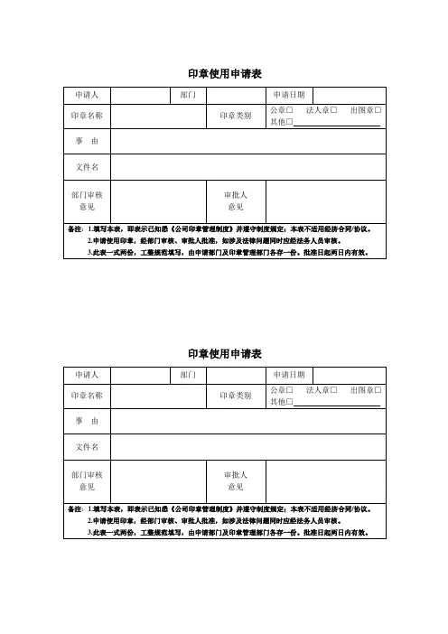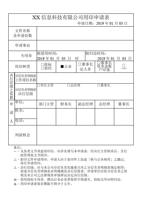 用印申请表申请人申请部门用印页数用印份数用印文件名申请理由:直接责任人:签名:部门负责人审查申请理由是否合理签名:分管副总经理审查申请理由是否充分签名:总经理审查申请理由是否合理,充分签名:空白稿纸或介绍信盖印章申请表申请部门申请日期申请人申请人联系方式需盖张数使用有效期限申请理由:使用范围:直接责任人本人保证按照公司公章管理规定办理用印手续,如有违反规定愿意承担相应的法律责任签名:日期:部门负责人审查申请理由是否合理签名:日期:总经办负责人审查申请理由是否充分签名:日期:分管副总经理审查申请理由是否充分,合理签名:日期:总经理是否同意签名:日期:外借印章申请表申请部门申请日期申请人申请人联系方式使用时间归还时间申请理由:直接责任人本人保证按照公司公章管理规定办理用印手续,如有违反规定愿意承担相应的法律责任签字:日期:部门负责人审查申请理由是否充分签字:日期:总经办负责人审查申请理由是否合理签字:日期:分管副总经理审查申请理由是否充分合理签字:日期:总经理是否同意申请签字:日期:职能部门合同评审及用印申请表申请部门申请日期申请人用印人合同协议名称合同主要内容(标的物,金额等)合同生效时间合同失效时间合同签约双方甲方乙方请按照下面流程办理审批手续合同执行部门直接责任人全面审核合同的具体条款,对合同的真实性,完整性,准确性负全责。