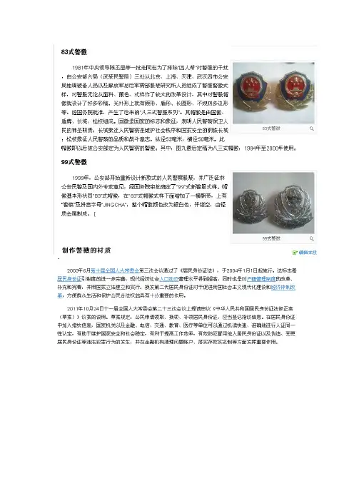 咱珍藏的警服演变标志献给第1个人民警察节(组图)咱珍藏的警服演变标志献给第1个人民警察节(洪哥警影新浪博客 2021-1-10 )△致敬今天:2020-1-10 ——第1个中国人民警察节!△从警藏品:中国人民警察纪念邮册(封面)72式、83式、99式警察帽徽△从警藏品:83式警察帽徽、公安三等功奖章△咱的父母五十年代初期解放军公安部队老照片△ 咱1980年春从警之后的经历的警服演变,真切见证了改革开放40年以来,我国警服标志的时代轨迹和更新历程!【写在前面】帽徽、领章、肩章、臂章等警服标志,是指整个警察系列统一的服饰标志,是警察身份和执法的重要象征,体现着一个国家警察力量的精神风貌。