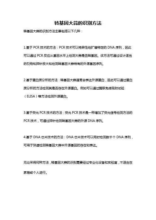 1.基于PCR技术的方法:PCR技术可以特异性地扩增特定的DNA序列,因此可以通过PCR反应从基因水平上检测大蒜是否转基因。