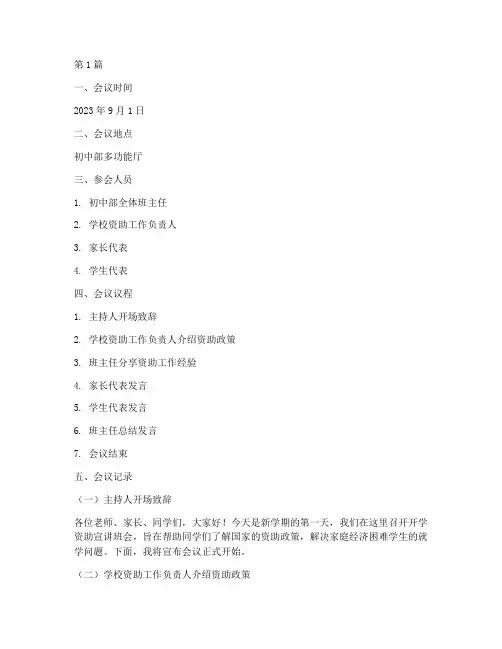二、班会流程1. 主持人开场班会由学生资助管理中心负责人主持,他首先对到场的学生表示欢迎,并简要介绍了本次班会的目的和意义。