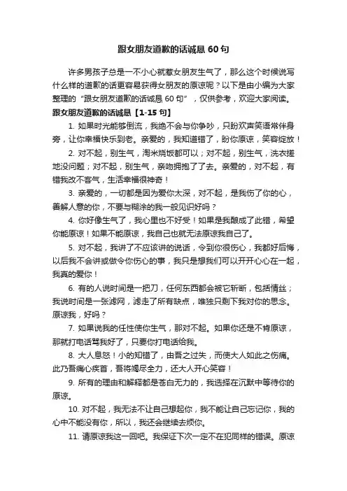 跟女朋友道歉的话诚恳60句许多男孩子总是一不小心就惹女朋友生气了,那么这个时候说写什么样的道歉的话更容易获得女朋友的原谅呢?以下是由小编为大家整理的“跟女朋友道歉的话诚恳60句”,仅供参考,欢迎大家阅读。