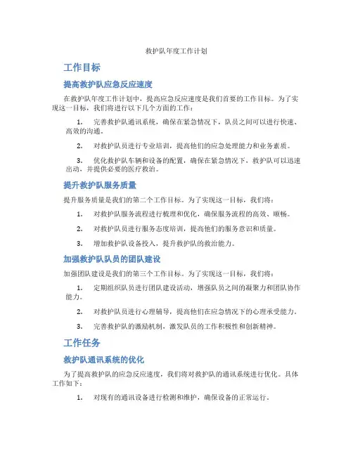 救护队年度工作计划工作目标提高救护队应急反应速度在救护队年度工作计划中,提高应急反应速度是我们首要的工作目标。