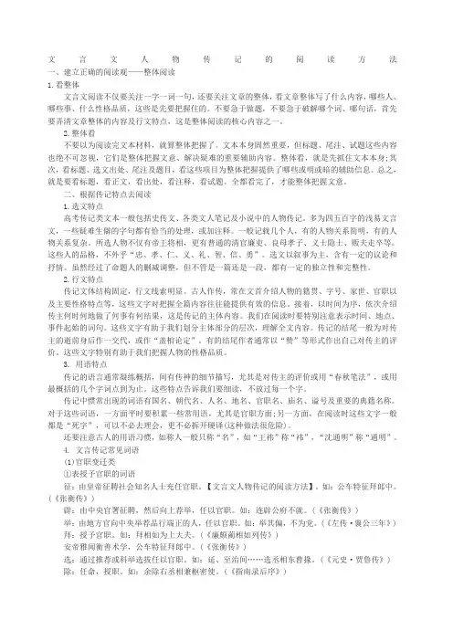 文言文人物传记的阅读方法一、建立正确的阅读观——整体阅读1.看整体文言文阅读不仅要关注一字一词一句,还要关注文章的整体,看文章整体写了什么内容,哪些人、哪些事、什么性格品质,这些是先要把握住的。