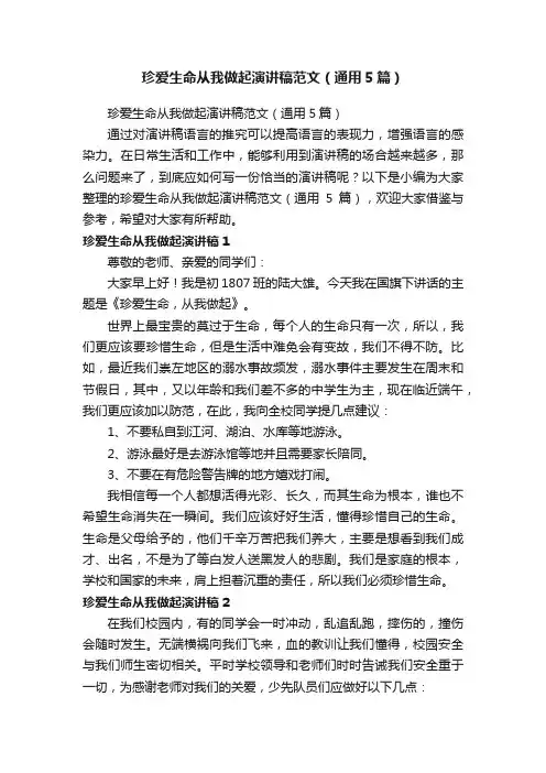 珍爱生命国旗下讲话稿珍爱生命国旗下讲话稿(通用5篇)在当下社会,我们很多时候都不得不用到讲话稿,讲话稿可以起到整理讲话者的思路、控制时间的作用。