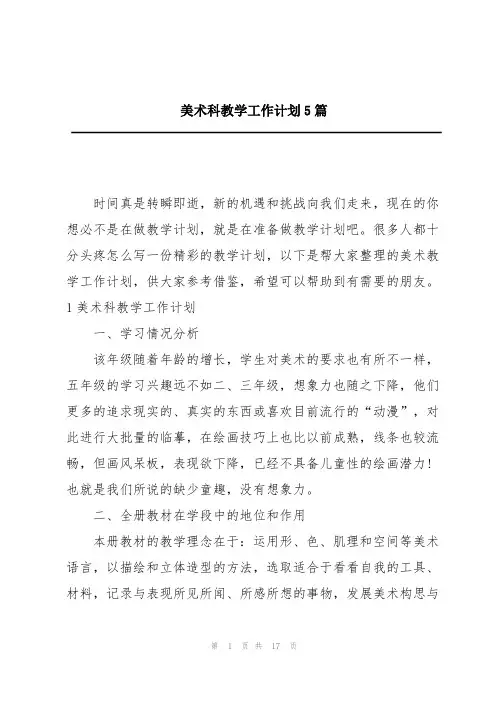 美术学科教学工作计划5篇1一、总体思路本教材的编写注重学生审美感受和视觉经验的培养,强调学生创新意识和实践能力的协调发展,以"接近社会,贴近学生,学已致用"为原则,选择符合五年级小学生身心特点的教学内容。
