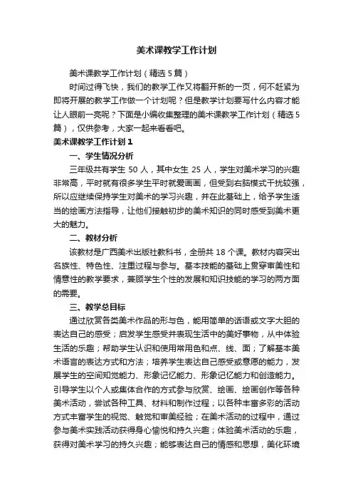美术课教学工作计划美术课教学工作计划(精选5篇)时间过得飞快,我们的教学工作又将翻开新的一页,何不赶紧为即将开展的教学工作做一个计划呢?但是教学计划要写什么内容才能让人眼前一亮呢?下面是小编收集整理的美术课教学工作计划(精选5篇),仅供参考,大家一起来看看吧。