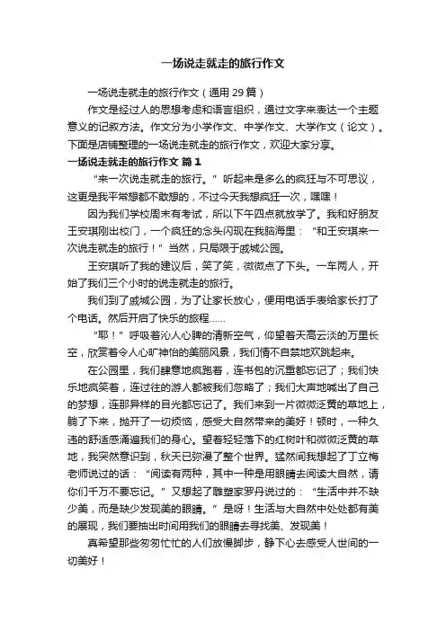 一场说走就走的旅行作文一场说走就走的旅行作文(通用29篇)作文是经过人的思想考虑和语言组织,通过文字来表达一个主题意义的记叙方法。