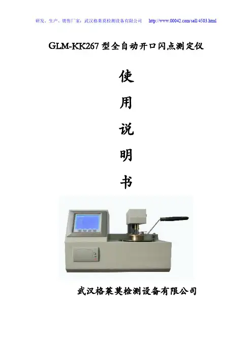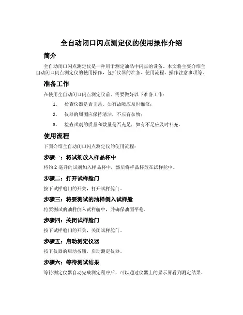 全自动开口闪点测定仪使用方法及操作步骤全自动开口闪点测定仪使用方法及操作步骤⒈介绍全自动开口闪点测定仪(简称闪点仪)是一种用于测量液体或固体样品的开口闪点的仪器。