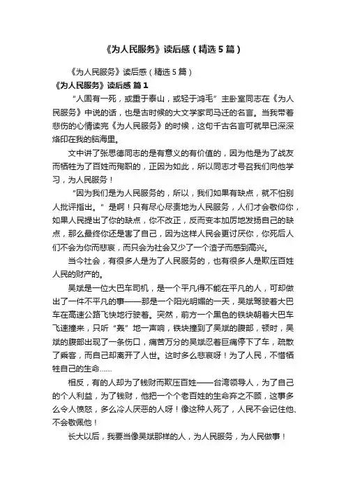 《为人民服务》读后感(精选5篇)《为人民服务》读后感(精选5篇)《为人民服务》读后感篇1“人固有一死,或重于泰山,或轻于鸿毛”主卧室同志在《为人民服务》中说的话,也是古时候的大文学家司马迁的名言。