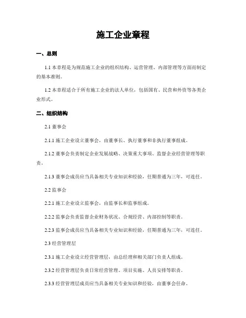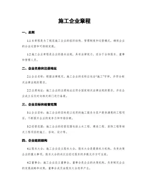 施工企业章程1. 章程目的和背景本章程旨在规范施工企业的运营和管理,确保企业的合法性、稳定性和可持续发展。