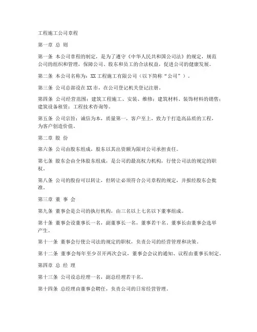 工程施工公司章程第一章总则第一条本公司章程的制定,是为了遵守《中华人民共和国公司法》的规定,规范公司的组织和管理,保障公司、股东和员工的合法权益,促进公司的健康发展。