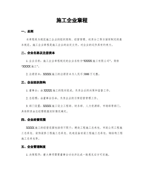 二、企业名称和注册资本1. 企业名称:施工企业章程2. 注册资本:人民币500万元三、企业组织结构1. 董事会:负责企业的决策和战略规划,由不少于3名董事组成,其中包括董事长和副董事长。