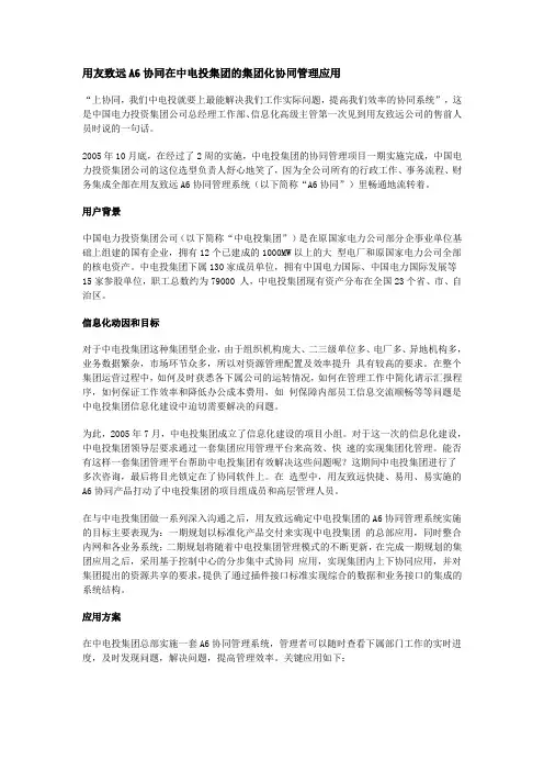 用户背景中国电力投资集团公司(以下简称“中电投集团”)是在原国家电力公司部分企事业单位基础上组建的国有企业,拥有12个已建成的1000MW以上的大型电厂和原国家电力公司全部的核电资产。
