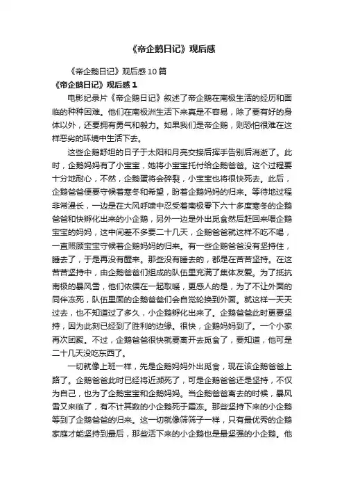 《帝企鹅日记》观后感《帝企鹅日记》观后感10篇《帝企鹅日记》观后感1电影纪录片《帝企鹅日记》叙述了帝企鹅在南极生活的经历和面临的种种困难。