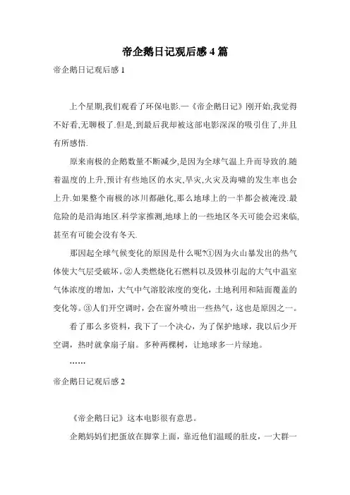 帝企鹅日记观后感4篇帝企鹅日记观后感1上个星期,我们观看了环保电影.—《帝企鹅日记》刚开始,我觉得不好看,无聊极了.但是,到最后我却被这部电影深深的吸引住了,并且有所感悟.原来南极的企鹅数量不断减少,是因为全球气温上升而导致的.随着温度的上升,预计有些地区的水灾,旱灾,火灾及海啸的发生率也会上升.如果整个南极的冰川都融化,那么地球上的一半都会被淹没.最危险的是沿海地区.科学家推测,地球上的一些地区冬天可能会迟来临,甚至有可能会没有冬天.那因起全球气候变化的原因是什么呢?①因为火山暴发出的热气体使大气层受破坏。