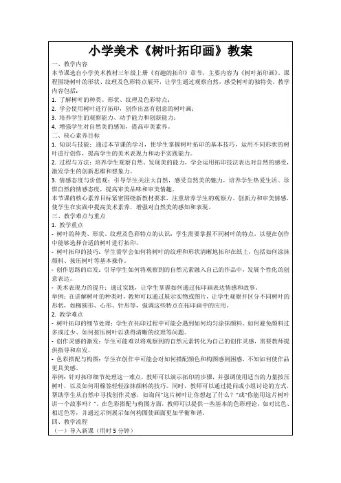 二、教学重点和难点1. 教学重点:树叶拓印画的基本原理和制作方法,树叶拓印画的技巧和注意事项。