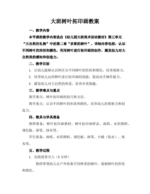 六、板书设计1. 大班树叶拓印画2. 内容:步骤1:准备画纸、水彩颜料、树叶等材料。