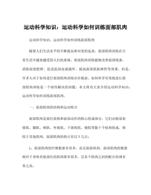 三、面部肌肉训练的方法面部肌肉训练的方法可以分为以下几类:1、表情训练。