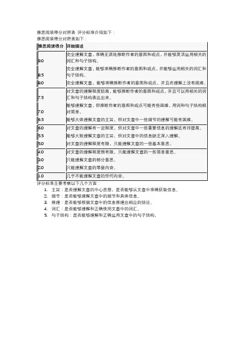 总之,IELTS阅读评分标准是根据正确回答的问题数量和难度来计算的,考生需要认真备考,提高自己的阅读能力和应试技巧,以获得更好的成绩。
