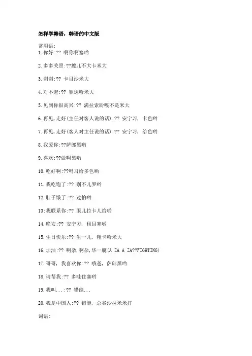 怎样学韩语,韩语的中文版常用语:1.你好: 啊你啊塞哟2.多多关照: 擦儿不大卡米大3.谢谢: 卡目沙米大4.对不起: 罪送哈米大5.见到你很高兴: 满拉索盼嘎不是米大6.再见,走好(主任对客人说的话): 安宁习, 卡色哟7.再见,走好(客人对主任说的话): 安宁习, 给色哟8.我爱你: 萨郎黑哟9.喜欢: 做啊黑哟10.吃好啊: 吗习给多色哟11.我吃饱了: 别不儿罗哟12.肚子饿了: 过怕哟13:我联系你: 眼儿拉卡儿给哟14.晚安: 安宁习, 租目塞哟15.生日快乐: 生一儿, 粗卡哈米大16.加油: 啊杂,啊杂,华一艇(A ZA A ZA FIGHTING)17.哥哥, 我喜欢你: 哦爸, 萨郎黑哟18.请帮我: 多哇住塞哟19.我叫...: 错能...20.我是中国人: 错能, 总谷沙拉米米打词语:1.知道: 啊拉嗦2.开始: 洗嫁3.勇气: 庸 gi(第三个声)4.王的男人: 枉gie腩人5.真是的: 啊西6.你先说: on这巴爹哟7.他们: kei du(第三声)8.没有(不是): 啊你哦9.你是谁?: 怕你衣死尬?10.你疯了: u捉索11.但是: 肯爹12.奇怪: 衣索念13.什么: 爹?14.是: 爹家庭:1.父亲: 啊波几2.母亲: 啊莫你3.祖父: 哈拉波几4.祖母: 哈日莫你5.叔叔: 身ten(第三声)6.阿姨: E莫7.女儿: 呆儿8.儿子: 啊得儿9.哥哥: 轰您(第三声)10.弟弟: 男东先11.姐姐: on你12.妹妹: 哟东先13.侄子: 左(第一声)卡14.妻儿: 不(第一声)印15.丈夫: 男骗儿16.孙子: 孙杂17.孙女: 孙女哟18.岳父: 汤引19岳母: 汤莫20.婴儿: 哟啊21.男士: 男杂22.女士: 哟杂23.朋友: 亲古24.同事: 东木25.搭档: 滩杂26.邻居: 衣屋27.孩子: 啊义28.青年: 称你恩29.成年: 孙你恩30.夫人: 不(第一声)印31.新郎: 新囊(第四声)32.新娘: 新补职业:1.演员: gie屋2.医生: A刹3.翻译: bwn 诺嘎4.警察: gon差儿5.老师: 称签您(第三声)6.讲师: 刚刹7.律师: gon诺刹8.记者: gi杂9.教授: 高属10.校长: 郭丈11.工程师: an军你儿12.农夫: 农(第一声)补13.画家: 花尬14.政治家: 睁西尬15.店员: 种稳16.经理: 江里17.理发师: E把刹18.音乐家: 饿妈尬19.公务员: 公木稳20.作家: 杂尬21.秘书: 逼索(第四声)22.外交家: 岳郭gun(第三声)23.舞蹈家: 木拥尬24.检查官: 工擦关25.部长: 不(第一声)丈26.董事长: E刹丈27.董事: E刹28.业务员: 喔木稳29.公司职员: 挥杀稳30.工人: 诺(第一声)东杂31.社长: 擦丈32.家庭主妇: 尬种主补交通建筑物:1.人行道: 机多2.街道: 郭力3.方向: 帮hian儿4.路线: 挪(第一声)孙(第三声)5.火车: 低踏6.公共汽车: 波死7.卡车: 特落8.货车:特落9轿车: 杂东擦10.地铁: 机哈撤11.停车场: 朱擦丈12.高架: 郭尬13.加油站: 朱沟索14.轻轨: 机哈撤15.终点站: 通敏呢16.高速公路: 郭索多落17.出租车: TAXI。