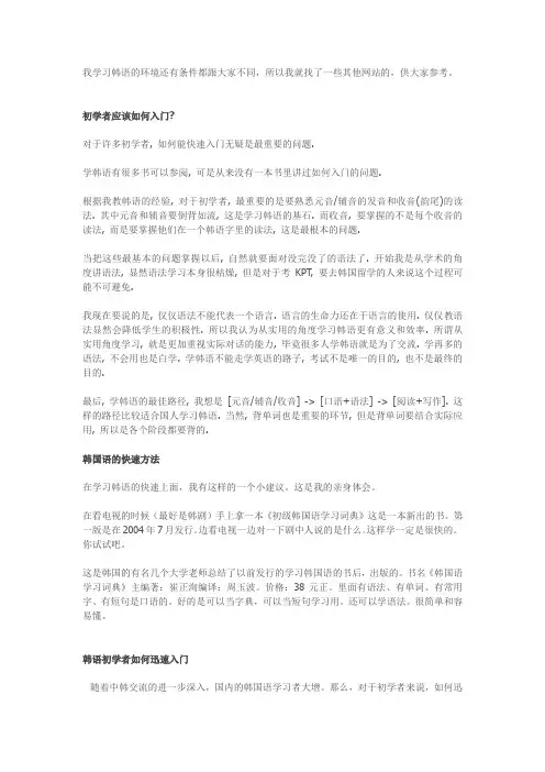 四、教材使用1. 《韩语初级教程》:此教材包含丰富的学习材料,包括文章、对话、练习等,适用于初学者。