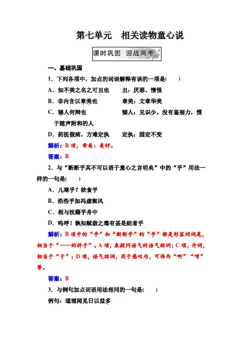 第七单元相关读物童心说一、基础巩固1.下列各项中,加点的词语解释有误的一项是()A.知不美之名之可丑.也丑:厌恶、憎恨B.非内含以章美..也章美:文章华美C.矮人..何辩也矮人:见识少,没有鉴别力,惯于随声附和的人D.药医假病,方难定执..定执:固定不变解析:B项,章美:美好。