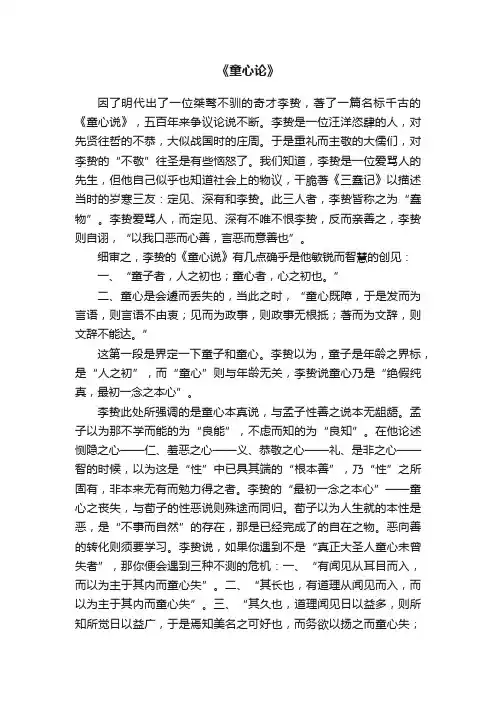 李贽以为,童子是年龄之界标,是“人之初”,而“童心”则与年龄无关,李贽说童心乃是“绝假纯真,最初一念之本心”。
