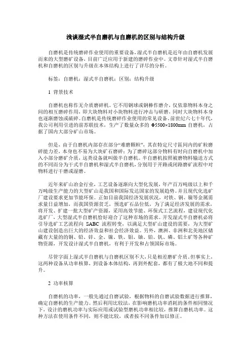 矿物加工中半自磨(自磨)工艺存在的问题及建议1.前言半自磨(自磨)磨机是一种具有粉碎和磨矿双重功能、一机两用的设备,以矿石本身作磨矿介质的是全自磨(AG),加入适量钢球作磨矿介质的是半自磨(SAG)。