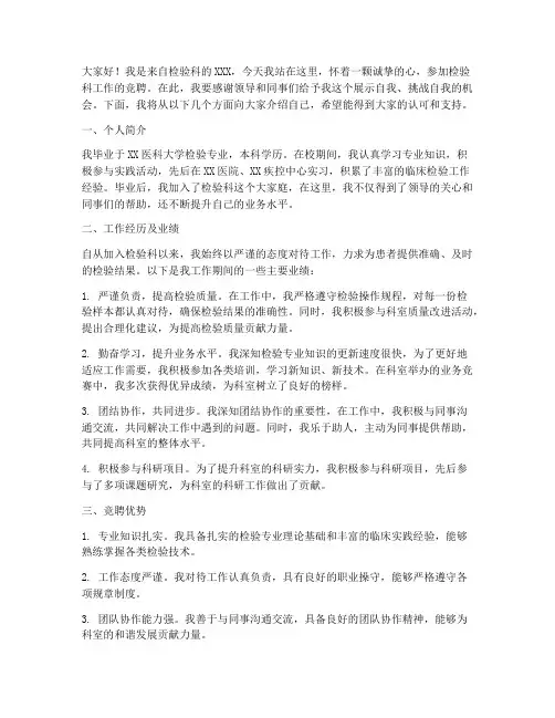 医院检验科竞聘演讲稿尊敬的评委、亲爱的各位领导、亲爱的同事们:大家好!我是来自医院检验科的一名员工,非常荣幸能够站在这里,参加竞聘演讲。