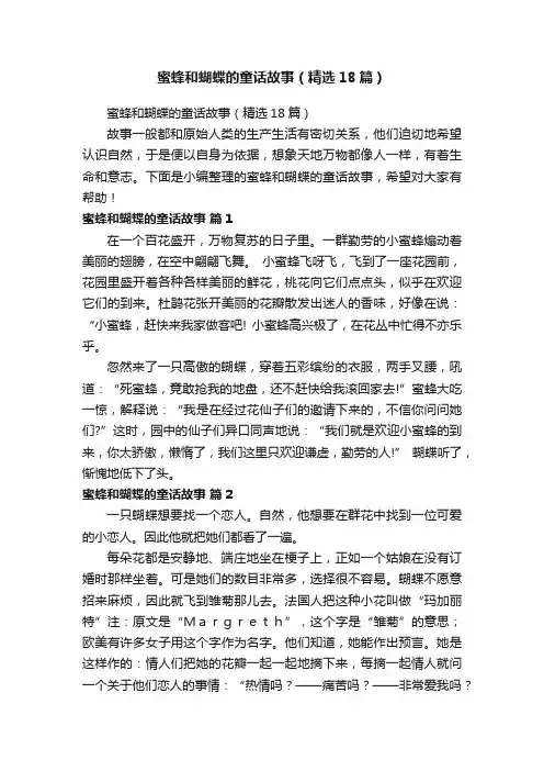 下面是店铺为您整理的关于蜜蜂的儿童故事,希望对你有所帮助!关于蜜蜂的儿童故事篇一:懒惰的小蜜蜂从前,有一只懒惰的小蜜蜂,她成天在树林里飞来飞去吸花蜜,采了就吃光,也不知道保存起来。