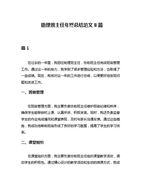 助理班主任年终总结范文8篇篇1在过去的一年里,我担任助理班主任,协助班主任完成班级管理工作。