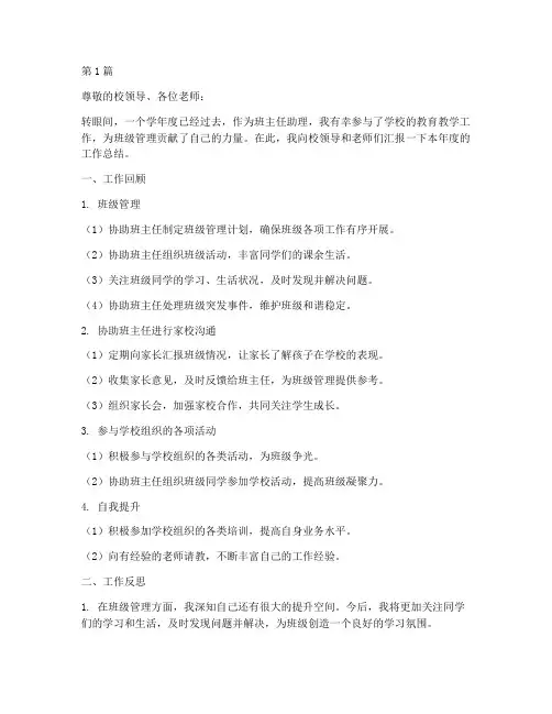 第1篇尊敬的校领导、各位老师:转眼间,一个学年度已经过去,作为班主任助理,我有幸参与了学校的教育教学工作,为班级管理贡献了自己的力量。