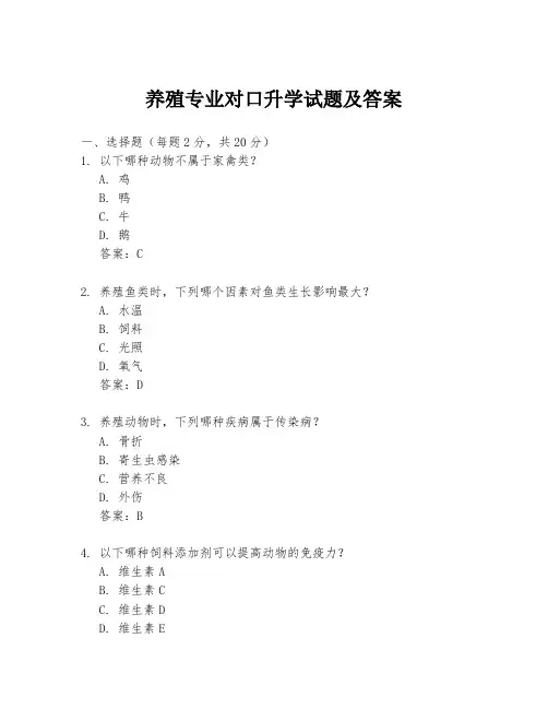 养殖专业对口升学试题及答案一、选择题(每题2分,共20分)1. 以下哪种动物不属于家禽类?A. 鸡B. 鸭C. 牛D. 鹅答案:C2. 养殖鱼类时,下列哪个因素对鱼类生长影响最大?A. 水温B. 饲料C. 光照D. 氧气答案:D3. 养殖动物时,下列哪种疾病属于传染病?A. 骨折B. 寄生虫感染C. 营养不良D. 外伤答案:B4. 以下哪种饲料添加剂可以提高动物的免疫力?A. 维生素AB. 维生素CC. 维生素DD. 维生素E答案:D5. 养殖动物时,下列哪种疫苗是预防禽流感的?A. 狂犬病疫苗B. 口蹄疫疫苗C. 禽流感疫苗D. 猪瘟疫苗答案:C6. 养殖动物时,下列哪种行为属于动物福利?A. 定期给动物洗澡B. 限制动物活动范围C. 强制动物交配D. 定期给动物打疫苗答案:A7. 养殖动物时,下列哪种饲料属于高蛋白饲料?A. 玉米B. 大豆C. 麦麸D. 鱼粉答案:D8. 养殖鱼类时,下列哪种水质指标对鱼类生长最为关键?A. pH值B. 溶解氧C. 水温D. 氨氮答案:B9. 养殖动物时,下列哪种疾病属于寄生虫病?A. 口蹄疫B. 禽流感C. 弓形虫病D. 猪瘟答案:C10. 养殖动物时,下列哪种饲料添加剂可以提高饲料的营养价值?A. 矿物质B. 维生素C. 抗生素D. 氨基酸答案:D二、填空题(每空2分,共20分)1. 养殖动物时,为了预防疾病,需要定期进行________。