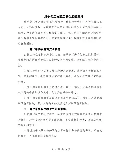 脚手架工程施工安全监控细则范本一、引言脚手架工程是建筑施工中常见的一种临时支撑结构,用于提供工人和材料的进出通道,为高空作业创造安全工作环境。