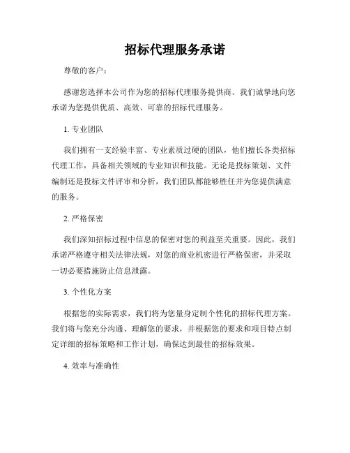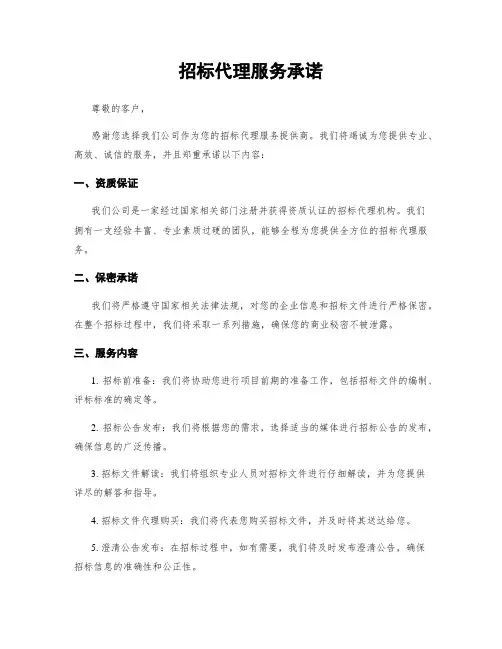 招标代理服务承诺一、服务承诺概述本公司郑重承诺,作为一家专业的招标代理服务机构,我们将以高质量、高效率、高信誉的标准为您提供全方位的招标代理服务。