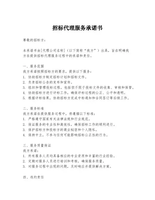 招标代理服务承诺书尊敬的招标方:本承诺书由[代理公司名称](以下简称“我方”)出具,旨在明确我方在提供招标代理服务过程中的承诺和责任。