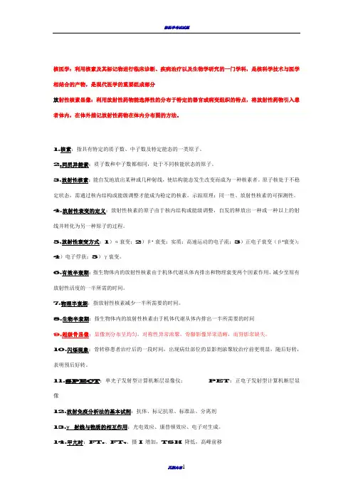 11.SPECT:单光子发射型计算机断层显像仪;PET:正电子发射型计算机断层显像12.放射免疫分析法的基本试剂:抗体、标记抗原、标准品、分离剂13.γ射线与物质的相互作用:光电效应、康普顿效应、电子对生成。